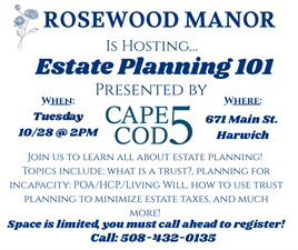 Please join us at Rosewood Manor on Tuesday October 28th at 2PM while we a host an information session on Estate Planning, presented by local bank Cape Cod Five! Topics of discussion will include: what is a trust?, Planning for Incapacity: POA/HCP/Living Will, How to use trust planning to minimize estate taxes and much more!