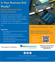 If you plan to exit your business someday, preparation matters. In this workshop, you will learn the strategies to help your business prepare, maximize value, and create a successful exit. This is a great opportunity to think ahead, protect what you've built, and plan for the future on your terms. Whether you're years away or just beginning to consider the next steps, this session will provide practical tools and insight.